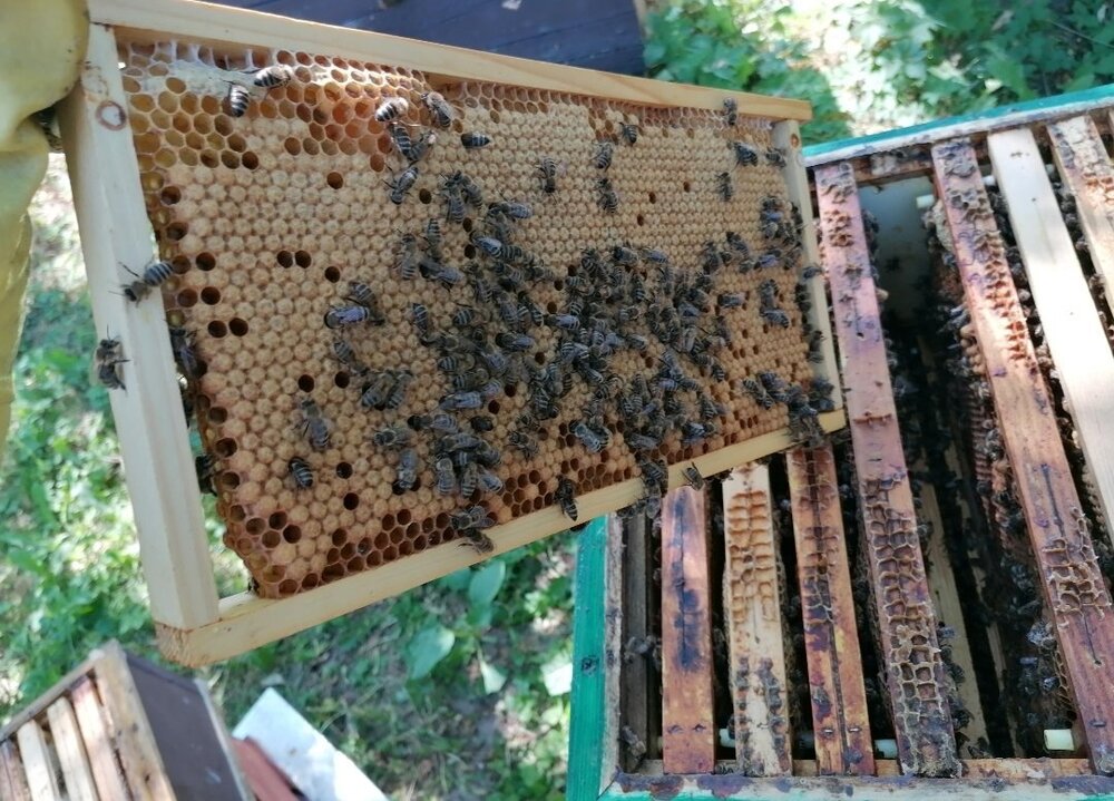 Krzychu Opublikowano 27 Sierpnia 2022 Autor Opublikowano 27 Sierpnia 2022 (edytowane) Dwie rodziny mniej. A może niedługo trzy. Jedna po zrzuceniu na susz z warszawiaka do korpusowego ztrutowiala. Druga, ta najspokojniejsza - kraina Sklenar dała się tak wyrabować, że aż zacięły matkę i sporo pszczół. Daszkiem wchodzily rabusie. Trzecia - od miesiąca nie ma już matki(czerwiącą nie przyjęły) pszczół mało. Dałem im dzisiaj kilka ramek z czerwiem w przewadze zamkniętym na wygryzieniu, oraz przypadkowo z matecznikiem na wygryzieniu - pozostałość po łączeniu dwa tyg temu. Trutni w rodzinach brak. Prócz tej strutowialej. Jest szansa na unasiennianie? Edytowane 27 Sierpnia 2022 przez Krzychu