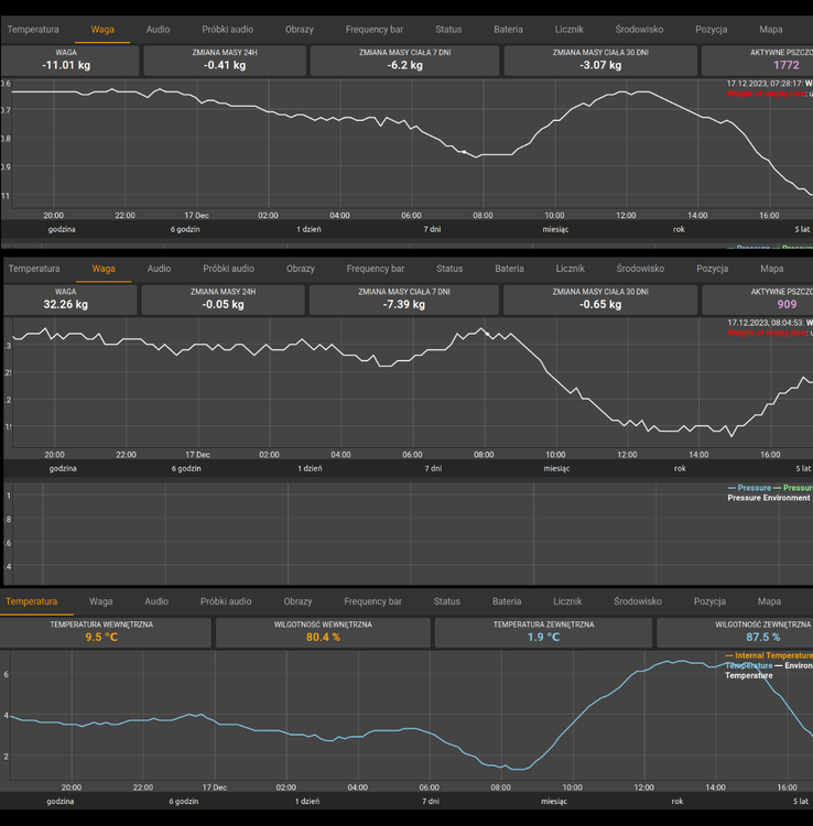 baru Opublikowano 15 Lipca 2020 Opublikowano 15 Lipca 2020 15_7:W:54.45(+0.54) TZ:20.4 WZ:59 15_5:W:53.91(+0.49) TZ:12.7 WZ:89 odczyt z dziś rana byłem w pasiece za dwadzieścia siódma ,pszczoły dopiero szły w pole bo było 10 st . a tu taki przybytek . Termometr na wadze jest osłonięty i pokazuje cieplejszą temp. Nie kładłem ciężaru statycznego po reklamacji więc nie wiem . Przedtem przy obciążeniu 50kg plus obudowa jakieś 60kg przy 2st 60,8 kg przy 17st 62,98 kg Cytuj